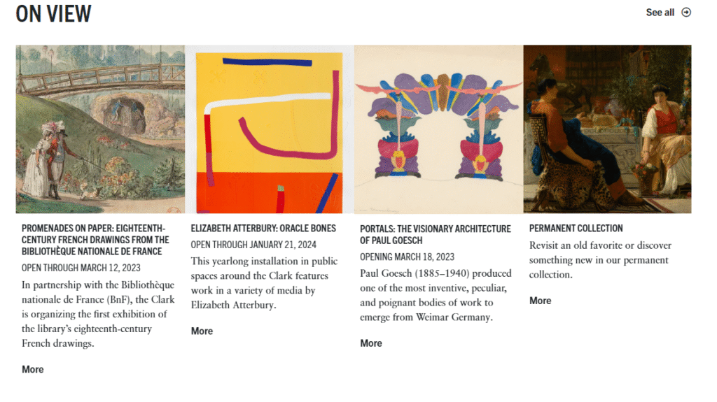 One of the finest college art museums in the country, the Williams College Museum of Art (WCMA) houses 12,000 works that span the history of art. Within the broad range of time periods and cultures represented, the collection emphasizes modern and contemporary art, American art from the late 18th century to present, and the art of world cultures. Admission to the museum is always FREE as are a host of educational programs that are available to the public.