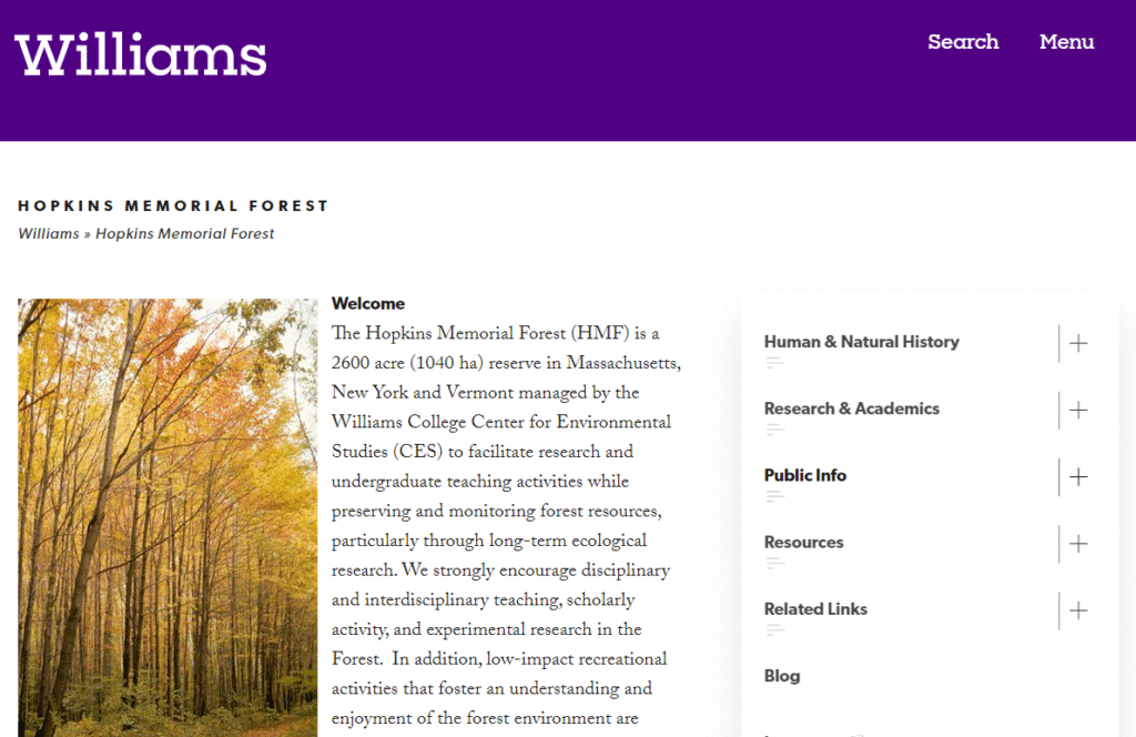 The Hopkins Memorial Forest (HMF) is a 2600 acre (1040 ha) reserve in Massachusetts, New York and Vermont managed by the Williams College Center for Environmental Studies (CES) to facilitate research and undergraduate teaching activities while preserving and monitoring forest resources, particularly through long-term ecological research. We strongly encourage disciplinary and interdisciplinary teaching, scholarly activity, and experimental research in the Forest. In addition, low-impact recreational activities that foster an understanding and enjoyment of the forest environment are encouraged.